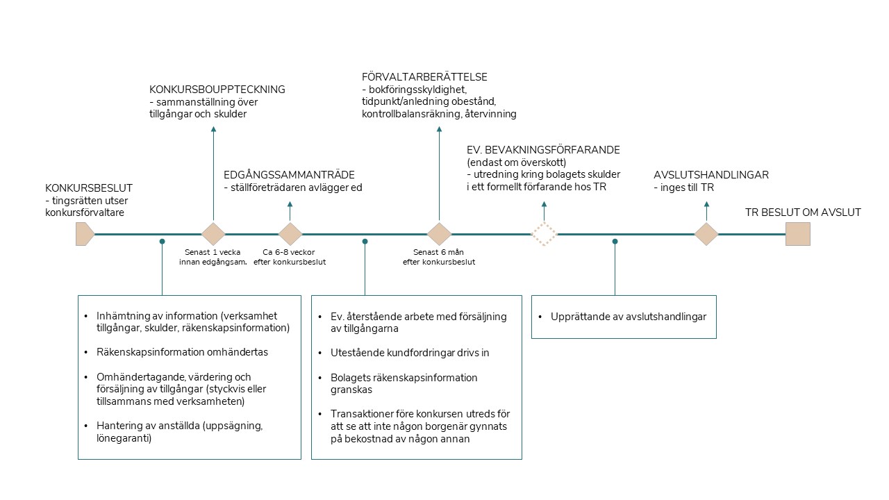 - När alla åtgärder är avklarade begär konkursförvaltaren att konkursen ska avslutas, varefter tingsrätten fattar ett formellt beslut om konkursens upphörande.